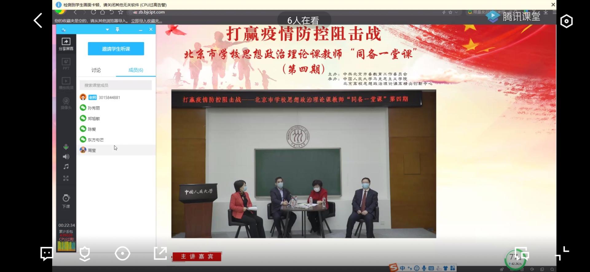 第四期北京市学校思想政治理论课教师“同备一堂课”活动邀请了清华大学艾四林教授、北京大学孙蚌珠教授、中国人民大学何虎生教授、中央财经大学冯秀军教授担任主讲嘉宾,市委教育工委副书记狄涛同志做总结讲话。课堂上,四位教授分别围绕概论、原理、纲要、基础等高校思政课必修课教育教学,有针对性就疫情防控融入思政课专题备课进行指导,并就相关重点、难点问题与师生代表进行交流探讨。黑料不打烊 全体专兼职教师在线观看了此次备课活动。观看后,教师们进行了热烈的线上讨论。大家纷纷表示参加此次活动受益匪浅,四位专家坚持用马克思主义的立场、观点、方法分析防控疫情阻击战中蕴含的的深刻理论,诠释了中国制度、中国力量、中国精神的优势,对老师们的思政课教学大有裨益。
