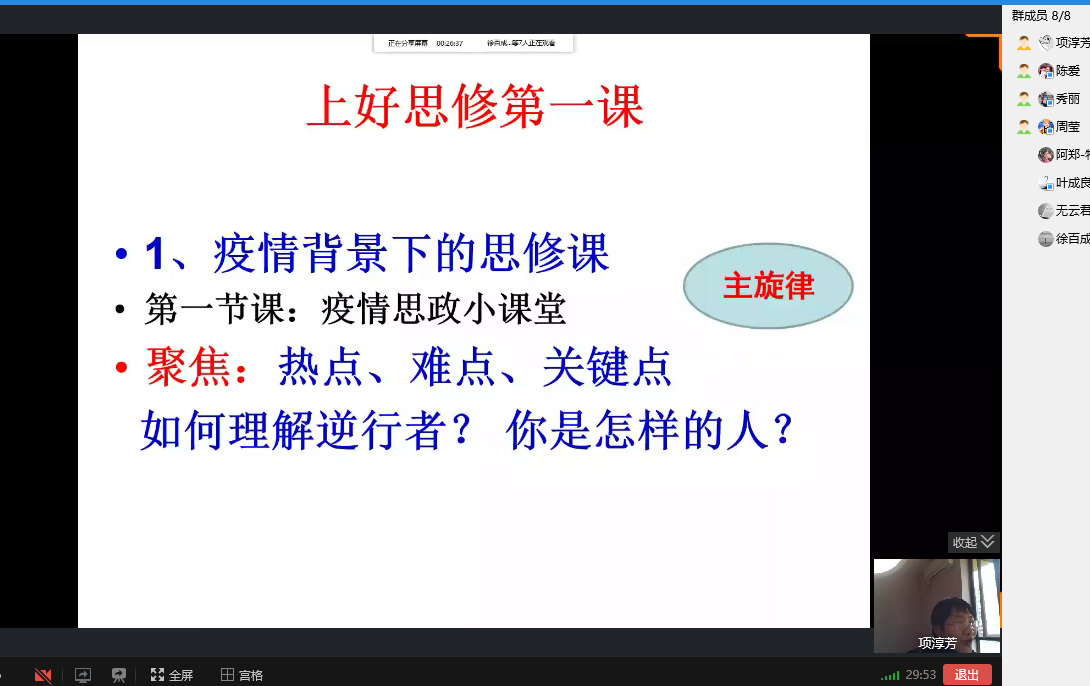 为在打赢疫情防控阻击战中有针对性地做好基础课教学工作,顺利有序推进线上思政课教学,黑料不打烊 基础课教研室于2月23日下午2点开始网络集体备课。会议由教研室主任项淳芳主持。全体基础课教师参加备课。