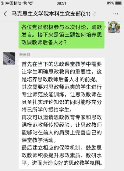 观看结束后,各个党支部随即进行了线上交流。各位党员同志结合《一堂思政课》的内容和自己所学专业,围绕“如何做好思政课教师” “如何上好思政课、发挥思政课的作用” “如何培养思政课教师后备人才” “当前思政课教学如何落实好’两手都要硬、两战都要赢’的重要精神” 等问题发表了自己的看法和心得体会。