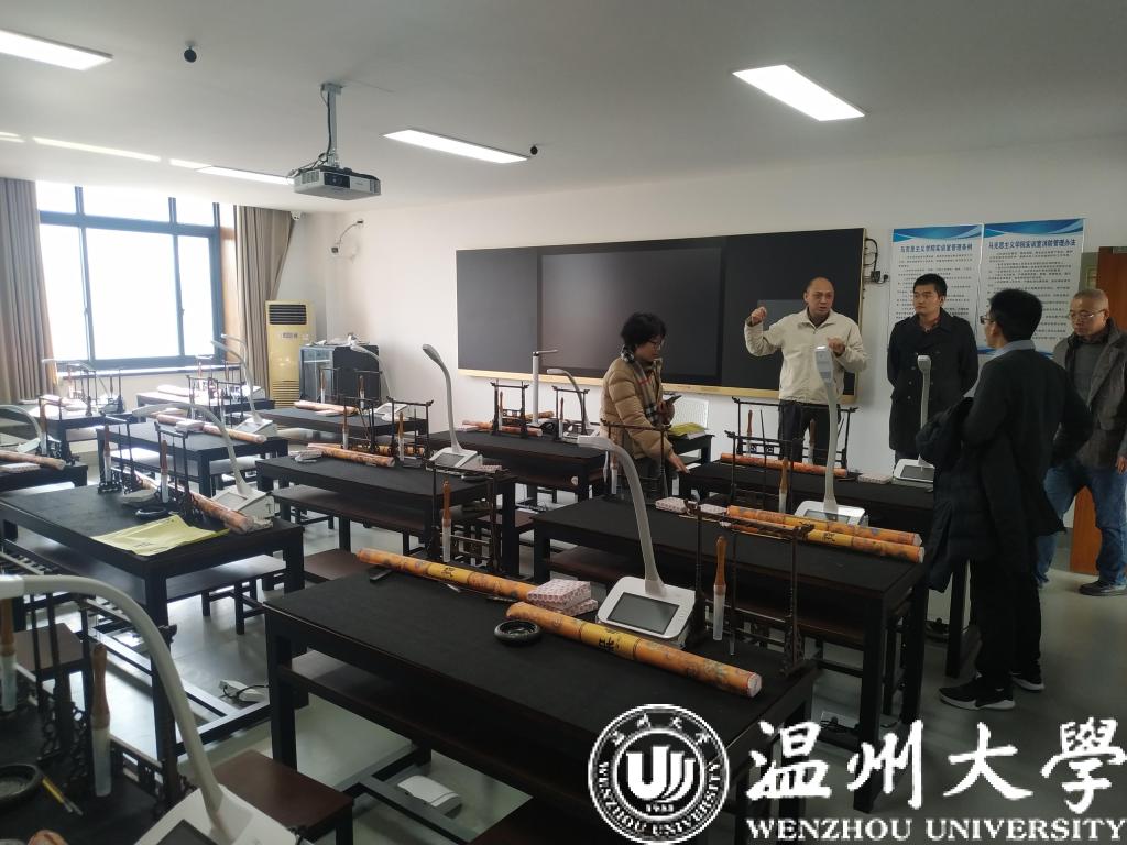 首先,章院长带领考察组一行实地观摩了绍兴文理学院马院教学实训中心,详细介绍了三笔字教室、虚拟情景实训室、微格教室、智慧教室的建设和使用情况。