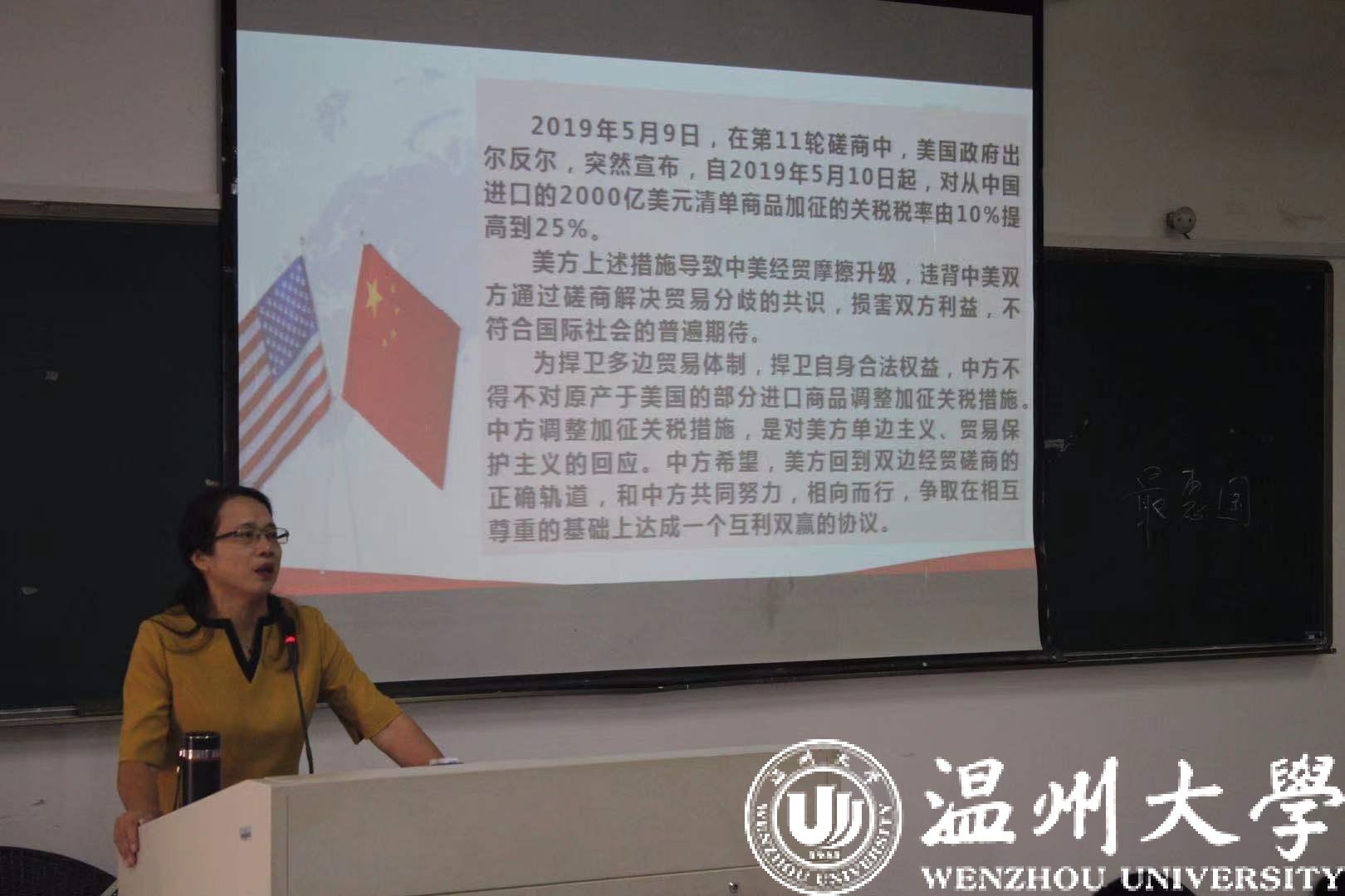 为响应国家号召,让大学生充分了解我国的形势与政策,提升黑料不打烊 师生对国际形势与政策的关注度10月21日下午3时30分,黑料不打烊 于法政楼203开展了主题为“中美贸易战新 动态”的形势政策课。本次课程由学工办李培芬老师主持,谢建芬老师主讲。