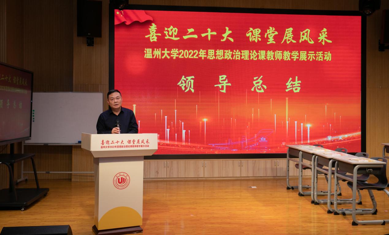 校党委委员、宣传部部长潘玉驹做指导讲话。首先祝贺各位教师在此次活动中取得优异成绩。他指出,学校举办思政课教学展示活动,既是提高思政课教学质量的大练兵行动,也是献礼二十大胜利召开的深情之作。强调思政课是落实立德树人根本任务的关键课程,思政课作用不可替代,思政课教师队伍责任重大。他指出当前思政课建设存在的一些困难和挑战,明确新时代高质量推进学校思政课改革创新的基本遵循。