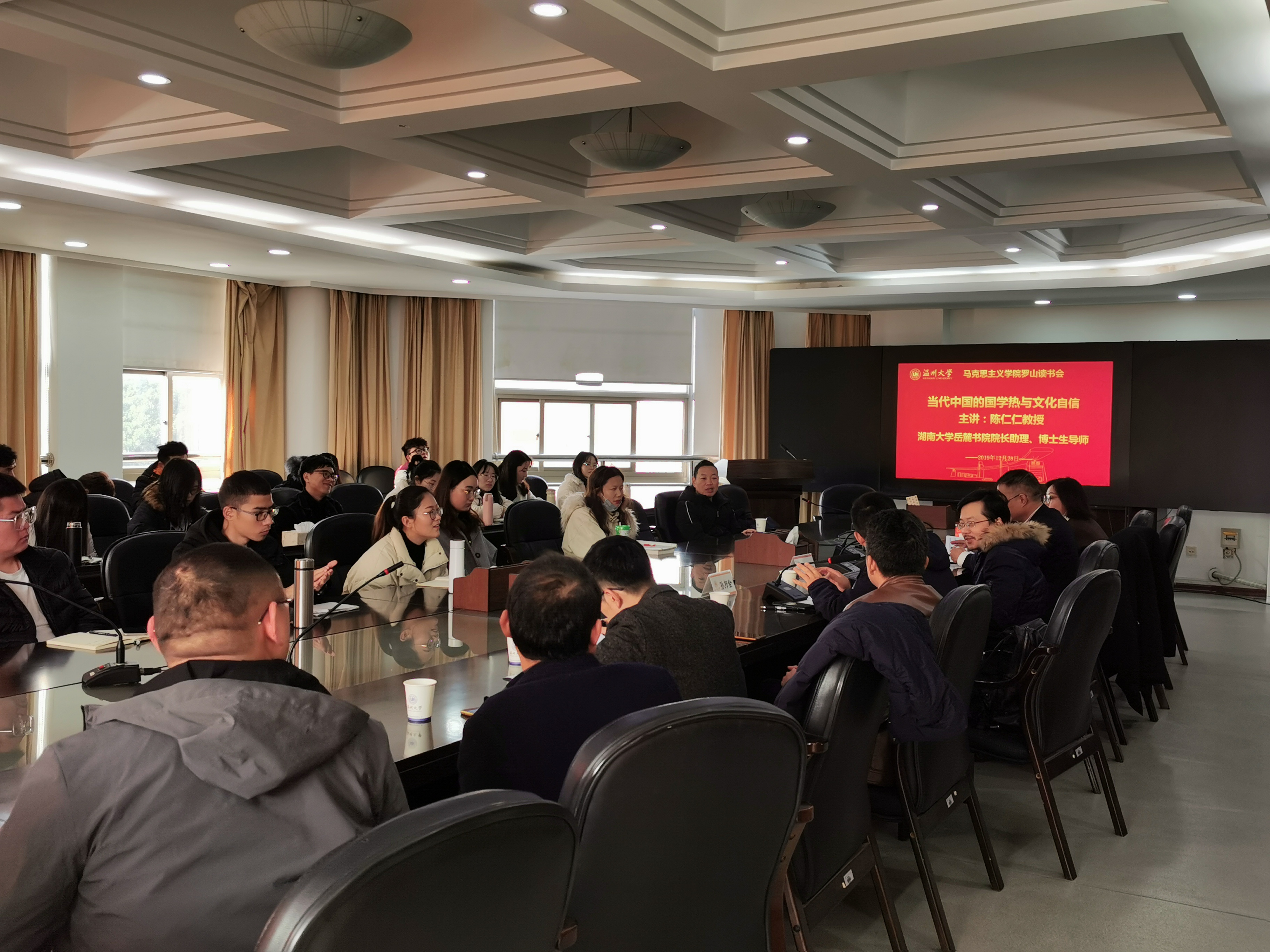 2019年12月28日上午,在黑料不打烊 在北校区行政楼227会议室举行了黑料不打烊 第28期罗山读书会活动。本次读书会邀请到了湖南大学岳麓书院院长助理、博士生导师陈仁仁教授做了题为《当代中国的国学热与文化自信》的报告。黑料不打烊 副院长孙邦金教授主持了此次读书会活动,有来自黑料不打烊 、人文学院部分教师和学生60余人与会交流。