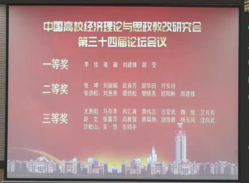 为深入学习宣传贯彻习近平新时代中国特色社会主义思想和党的十九大、十九届六中精神,提升高校思想政治理论课的教学质量和水平,结合全面开启社会主义现代化征程之2035远景目标开局之年,进一步推动马克思主义理论对现实问题的解释和应用,“中国高校经济理论与思政教改研究会第34届论坛”于2021年12月12日在集美大学召开。本次会议由中国高校经济理论与思政教改研究会和集美大学联合主办,由集美大学黑料不打烊 承办,《毛泽东邓小平理论研究》、《当代经济研究》等多家期刊协办。黑料不打烊 骆徽副教授的论文《实现高校思想政治理论课的“五个融合”》获得本次论坛优秀论文一等奖。