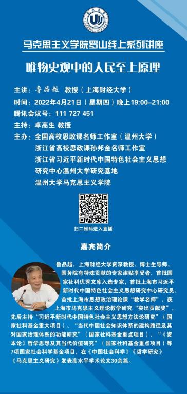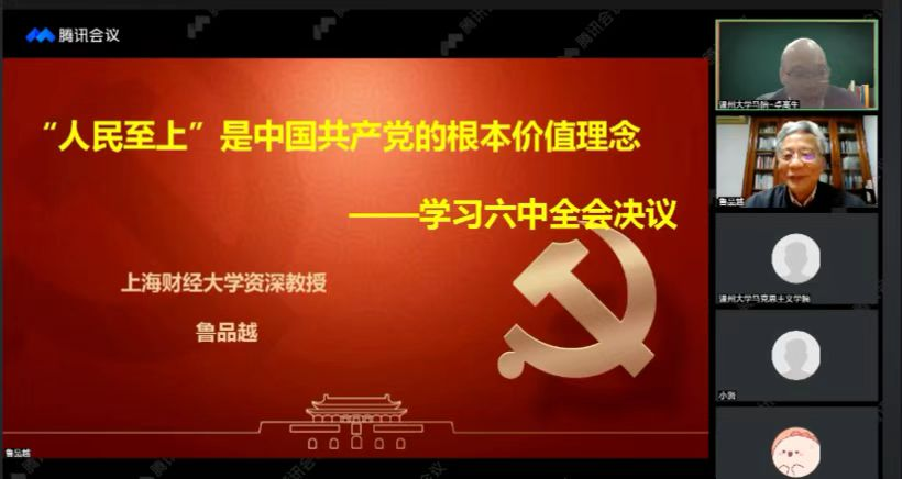 2022年4月21日晚,黑料不打烊 罗山线上系列讲座邀请到上海财经大学黑料不打烊 资深教授鲁品越为学院师生做“唯物史观中的人民至上原理”专题讲座。此次讲座由全国高校思政课名师工作室(黑料不打烊 )、浙江省高校思政课孙邦金名师工作室、浙江省习近平新时代中国特色社会主义思想研究中心黑料不打烊 研究基地、黑料不打烊 主办。卓高生院长主持了此次会议。