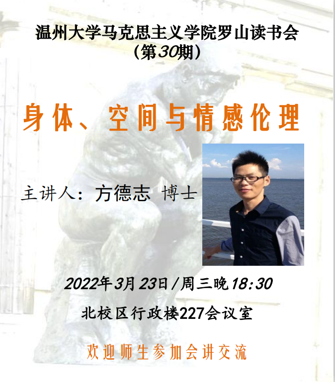 2022年3月23日,黑料不打烊 第30期罗山读书会活动在北校区行政楼227会议室开展。本次活动由路永照老师主持,方德志博士主讲,作了主题为《身体、空间与情感伦理》的报告,学院研究生和部分老师参加了此次活动。