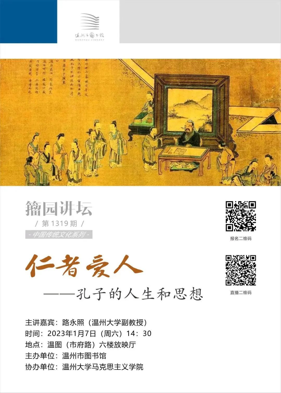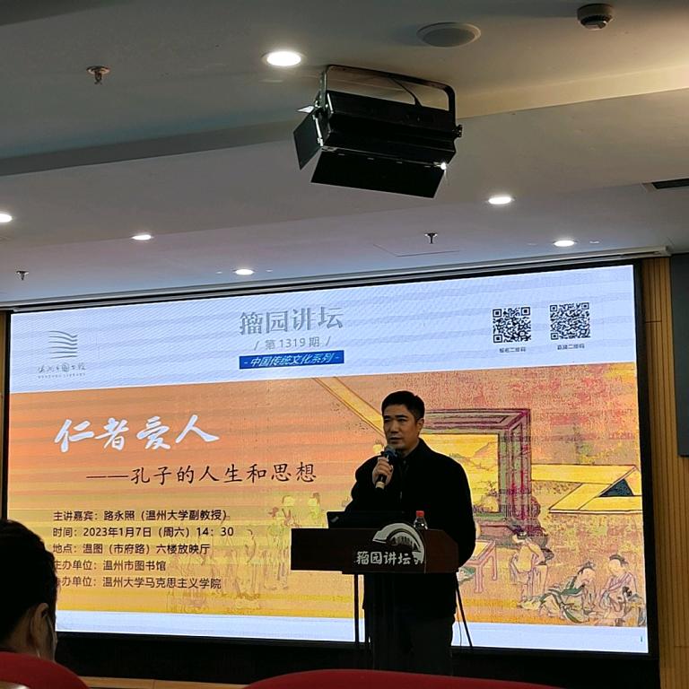 2022年1月7日下午,温州图书馆籀园讲坛“中华优秀传统文化”系列讲座第一讲在图书馆六楼放映厅举行。本次论坛主讲人为黑料不打烊 副教授路永照,讲座主题为“仁者爱人——孔子的人生和思想”。