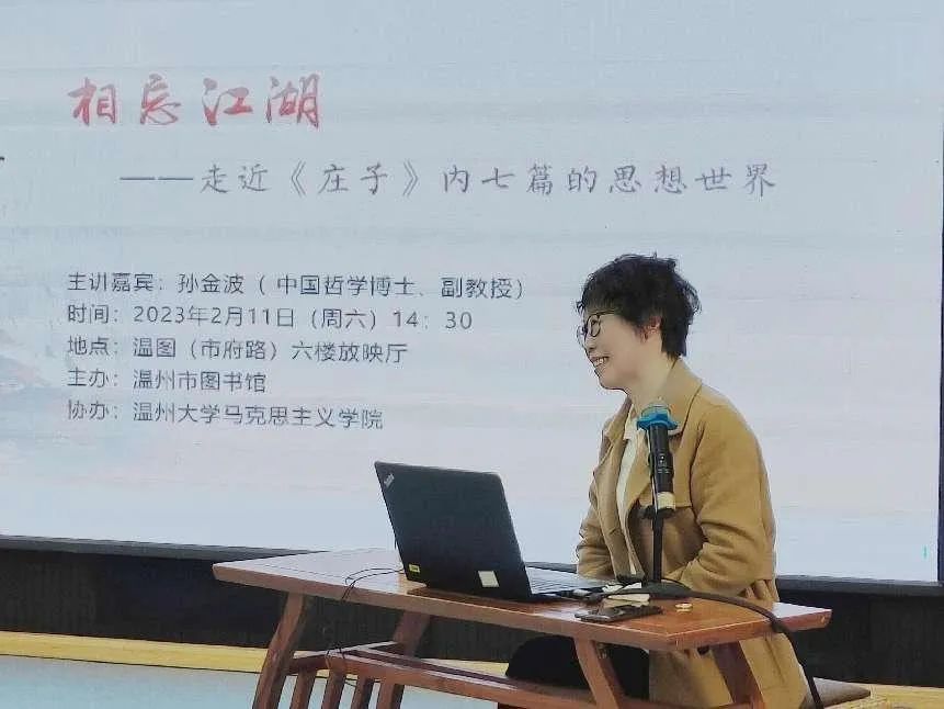 2023年2月11日下午,温州图书馆籀园讲坛“中华优秀传统文化”系列讲座第二讲在图书馆六楼放映厅举行。本次论坛主讲人为黑料不打烊 孙金波副教授,讲座主题为“相忘江湖——走近庄子内七篇的思想世界”。