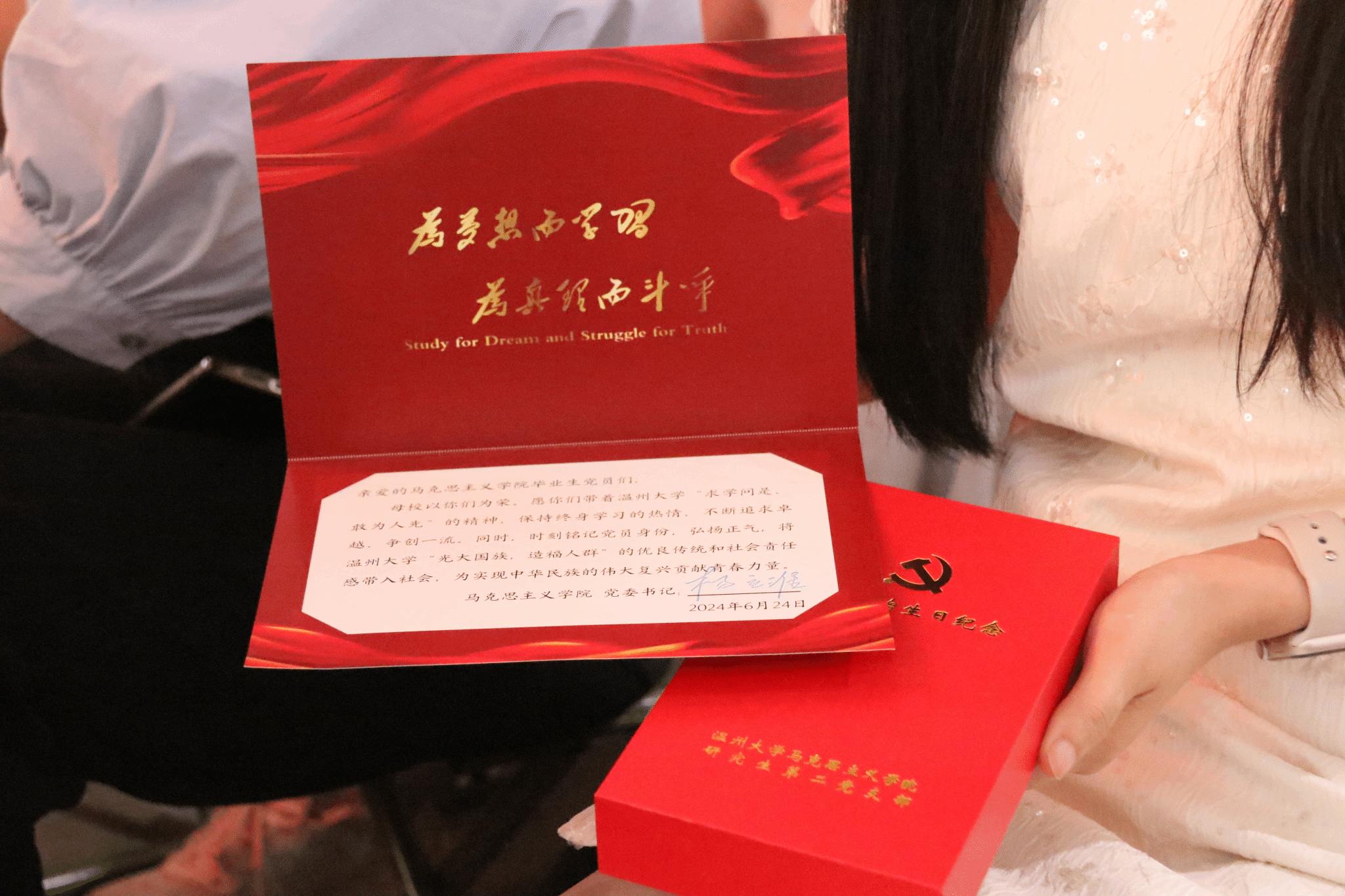学院党委书记杨立淮老师、学院党委副书记吴冬冬老师分别为研究生支部和本科生支部毕业党员发放“政治生日”纪念礼物和“致毕业生党员的一封信”,为毕业生送上诚挚的祝贺和美好的祝愿。希望大家牢记习近平总书记对青年的嘱托,坚定不移听党话、跟党走,不断提升自己的综合能力,努力成长为堪当民族复兴重任的时代新人。