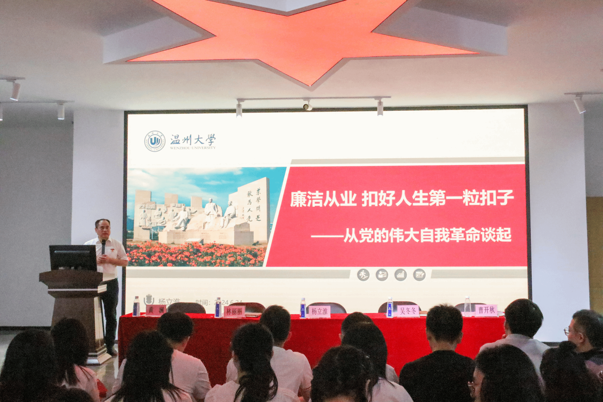 学院党委书记杨立淮老师以《廉洁从业扣好人生第一粒扣子 ——从党的伟大自我革命谈起》为主题,为全体毕业生党员上了“最后一堂党课”暨廉洁教育集体谈话。杨书记重点以“开辟百年大党自我革命新境界、深入推进全面从严治党、从违法违纪案件中汲取经验和教训”三个部分展开,告诫各位毕业生党员,“人生的扣子从一开始就要扣好”,要“深化运用党的自我革命历史经验,巩固拓展党纪学习教育成果”,并提出四点要求:一是加强理论与政策法规学习,做到守纪律、讲规矩;二是要在工作生活中时刻保持清醒的头脑,树立是非善恶的大局观念;三是在工作中合理、合规、合法履行职责,树立正确的权利观、义利观和价值观;四是在行动和思想上做到“慎独、慎微、慎初”,做助推事业发展的“护林人”。