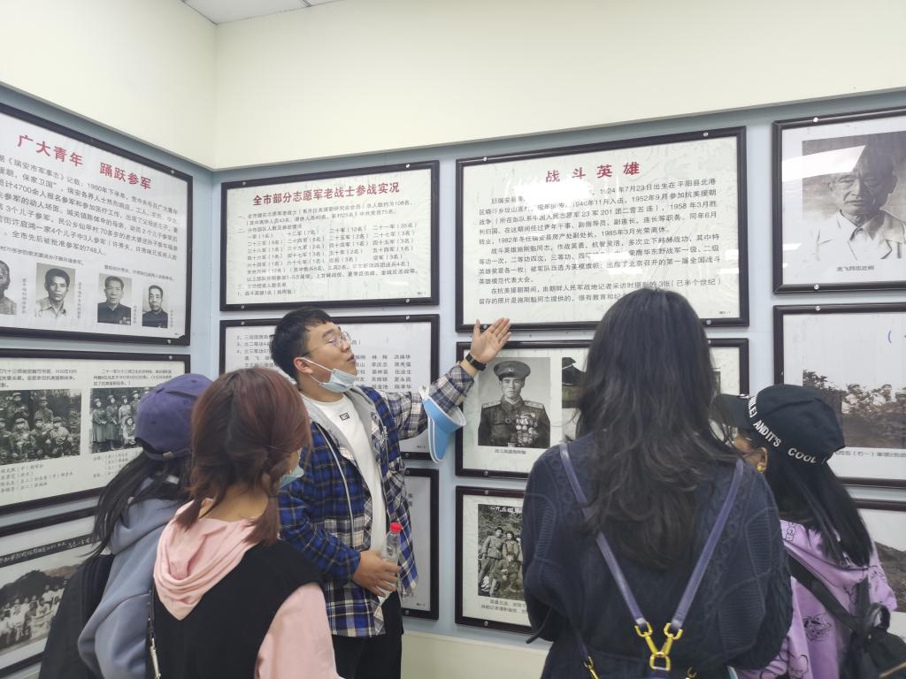 第二站师生党员参观了全国首家民办抗美援朝历史教育馆——瑞安市抗美援朝历史教育馆。通过展览的1100多幅图片和200多件实物,师生党员深入回顾了党中央和毛泽东同志作出抗美援朝出国作战重大决策的国际国内背景并领会其深远意义,重温战火纷飞的岁月中国人民志愿军舍生忘死不畏强敌的英雄气概和唱响的一首首荡气回肠的“英雄赞歌”,感悟“最可爱的人”保卫和平、反抗侵略的家国情怀,无不感慨战斗之惨烈、精神之可贵以及发自内心的“山河无恙,因为有你”的感恩与对当下幸福生活的珍惜。师生还了解了该馆创始人、三场战役亲历者马发泉前辈发扬“上甘岭精神”,历时10年筹资200万办馆的艰难历程,感佩老人的坚定信仰、高尚情怀和党性修养。抚今追昔,鉴往知来,马院师生党员将联系本次参观进一步学习研读《习近平在纪念中国人民志愿军抗美援朝出国作战70周年大会上的讲话》,并将精神贯彻到思政课教学研究和实际工作中,让伟大抗美援朝精神代代相传,历久弥新。