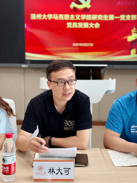 林大可老师为会议作最后总结。做好党员发展工作是党的事业继往开来,永葆生机活力的重要保障。加入中国共产党固然光荣,但也承载着更大的责任与担当。五位同志要以党员的标准严格要求自己,从思想上和行动上不断完善自己,以优秀的老党员为榜样,在工作中不断打造自己,做到心中有党,心中有民,心中有责,心中有戒,牢记初心使命,永不变色,争取早日成为合格的共产党员。