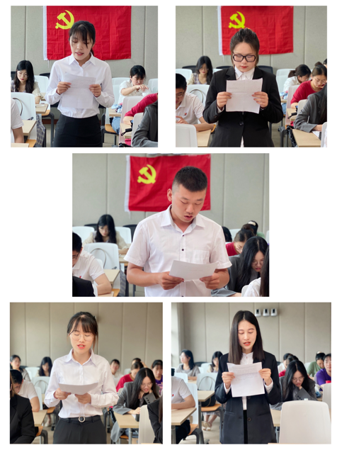 5名发展对象依次对党的认识、入党动机、本人履历、家庭成员和主要社会关系情况、现实表现等进行汇报。随后由各位入党介绍人介绍发展对象有关情况,并对其能否入党表明意见,组织委员杨帅杰同志代表支部委员会报告对各位发展对象的党内外群众意见座谈会情况和政治审查情况,林大可老师与各位党员同志发表意见。最后,经过全体党员现场票决,全票通过,同意接收冀鹏超、游淑卿、陈泓、刘岩、陈施施等五位同志为中共预备党员。
