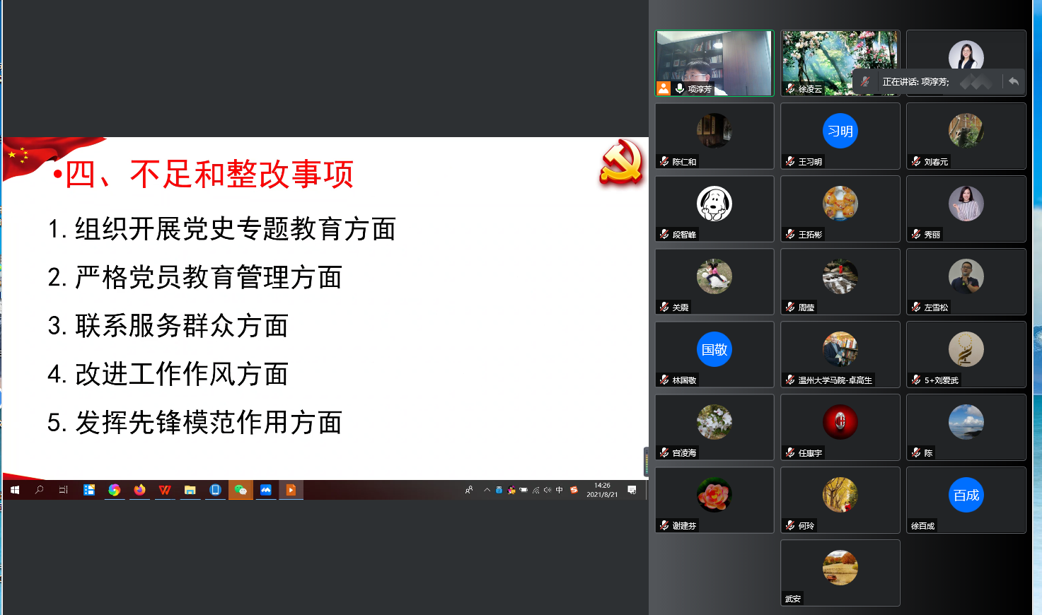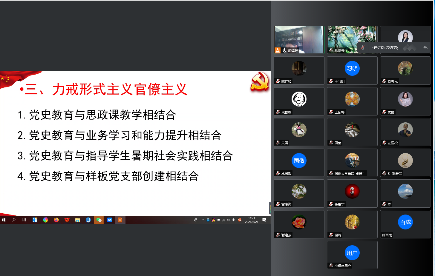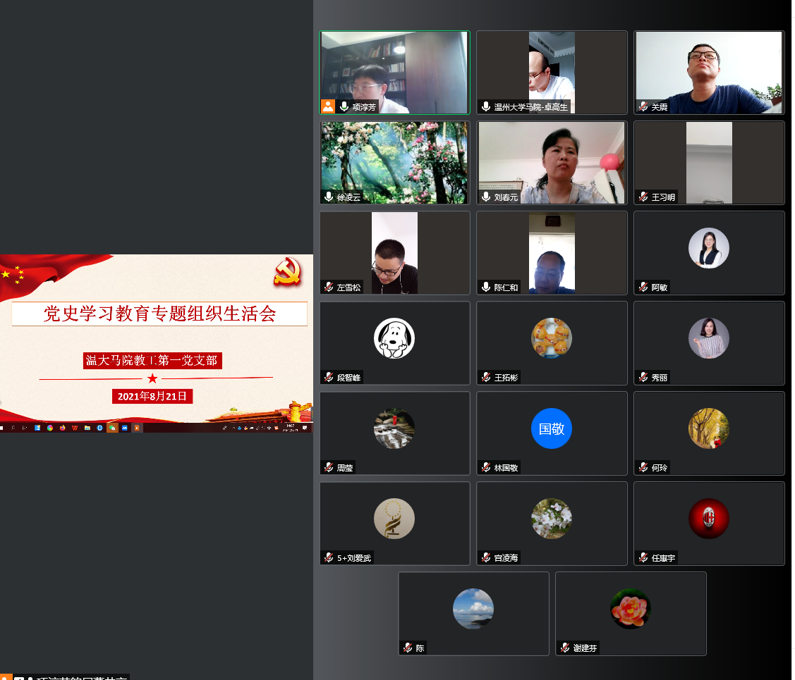 为贯彻落实市、校党史学习教育领导小组办公室部署和学院关于召开党史学习教育专题组织生活会方案的精神,8月21日下午,黑料不打烊 教工第一党支部围绕“学党史、悟思想、办实事、开新局”的主题,组织全体党员通过腾讯会议召开线上党史教育专题组织生活会。会议由党支部书记项淳芳同志主持,学院院长兼党委副书记卓高生同志以普通党员身份参加党支部和概论党小组的专题组织生活会。