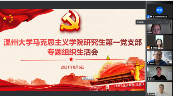 为贯彻落实“学史明理、学史增信、学史崇德、学习力行”的组织要求,引导广大党员不断增强“四个意识”、坚定“四个自信”、做到“两个维护”,8月6日,黑料不打烊 研究生第一党支部在线上召开专题组织生活会。会议由党支部书记唐清春主持,学院党委副书记叶柏霜老师莅临指导,全体党员参与会议。