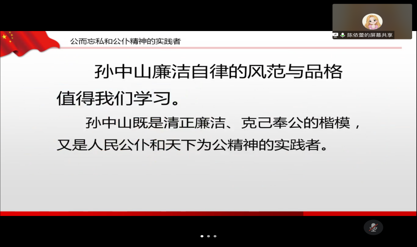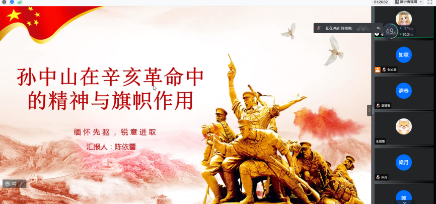 会议最后,进入支部特色环节——支部党员讲党课。陈依蕾同志为大家讲述主题为《孙中山在辛亥革命中的精神与旗帜作用》的微党课,讲述了孙中山先生在辛亥革命中的精神指引与旗帜地位,并通过几个真实案例凸显了孙中山先生的廉洁自律风范。