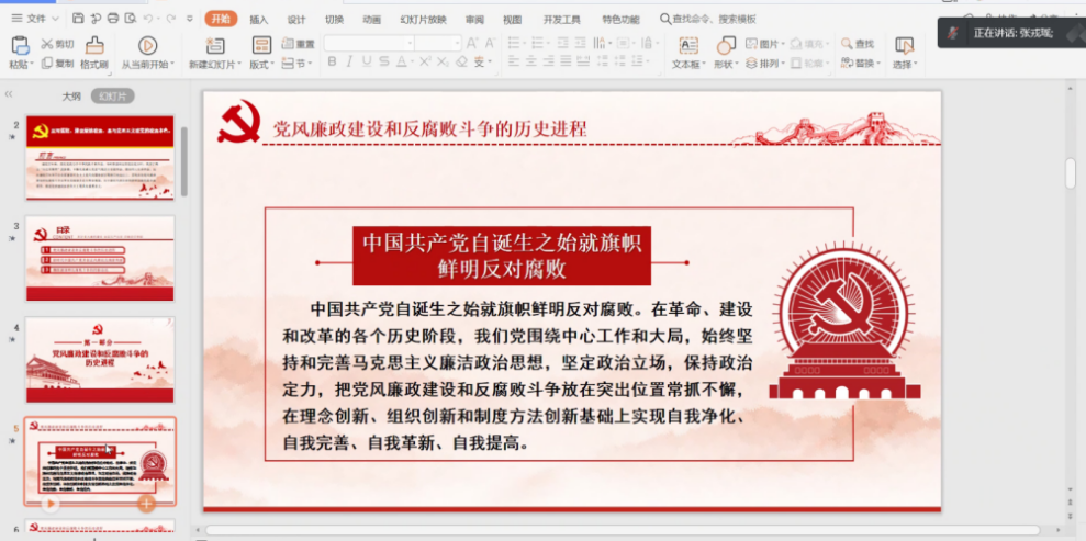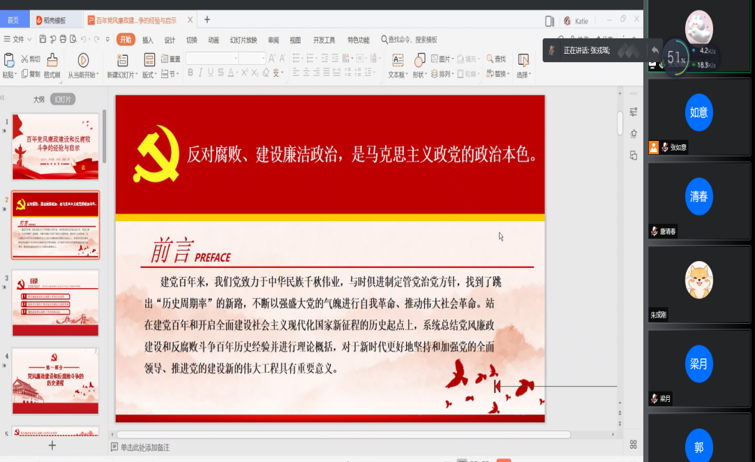 张戎瑶同志讲述的微党课主题为《百年党风廉政建设与反腐败斗争的经验与启示》。反对腐败、建设廉洁政治,是马克思主义政党的政治本色。中国共产党自诞生之始就旗帜鲜明反对腐败,我们要以永远在路上的执着和坚韧,充分发挥全面从严治党引领保障作用,以系统施治、标本兼治的理念开展党风廉政建设和反腐败斗争。
