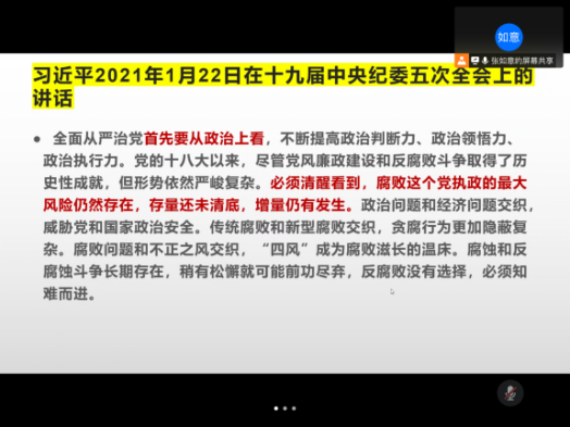 首先,党员同志们通过文字和视频相结合的形式,共同学习了《习近平论党风廉政建设和反腐败斗争(2021年)》文件以及《新中国成立之初的反腐败斗争》视频。在实现中华民族伟大复兴的战略全局和世界百年未有之大变局中,坚定不移地坚持中国共产党的领导,勇挑重担,苦干实干,节俭朴素,力戒奢靡,才能将共产主义事业进行到底!