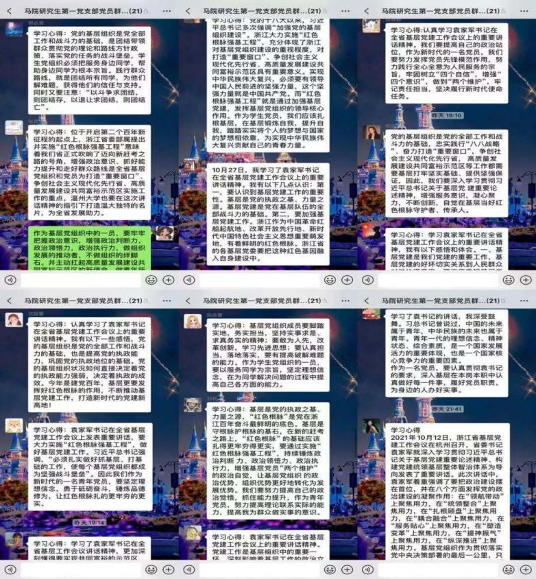 在建党百年和我省高质量发展建设共同富裕示范区起步的重要节点,支部全体党员发出了自己的心声,纷纷表示要认真贯彻袁家军书记的讲话精神,守护红色根脉,做基层党建发展的推动者、执行者,实干苦干,用青春奋斗书写属于自己的时代华章。