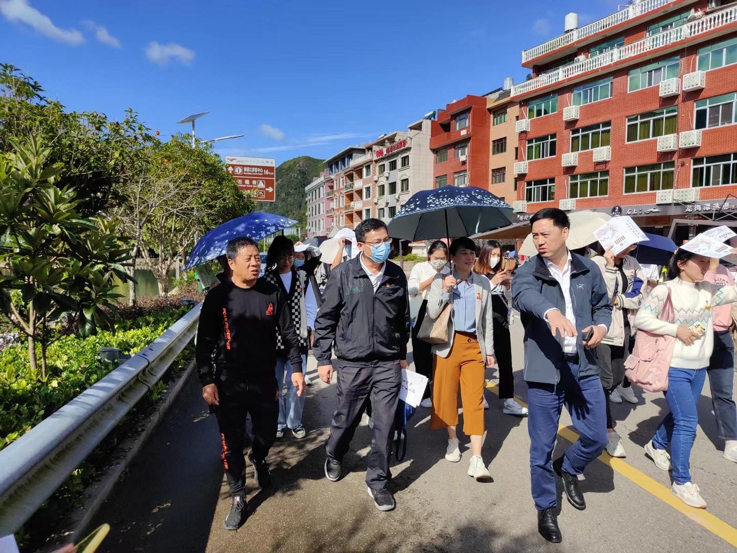 学院师生党员首先前往鹤盛岩上共同富裕示范村进行参观。鹤盛“乡村振兴 电力先行”示范区以服务地方特色旅游产业发展为核心,在国网永嘉县供电公司“一核、两站、三维、六服务”框架下,以固定电力驿站、流动电力驿站为载体,在电网层、网格层、单元层三个层面,开展优质供电、阳光办电、安全用电、绿色发展、爱心助农、文化下乡六方面服务。