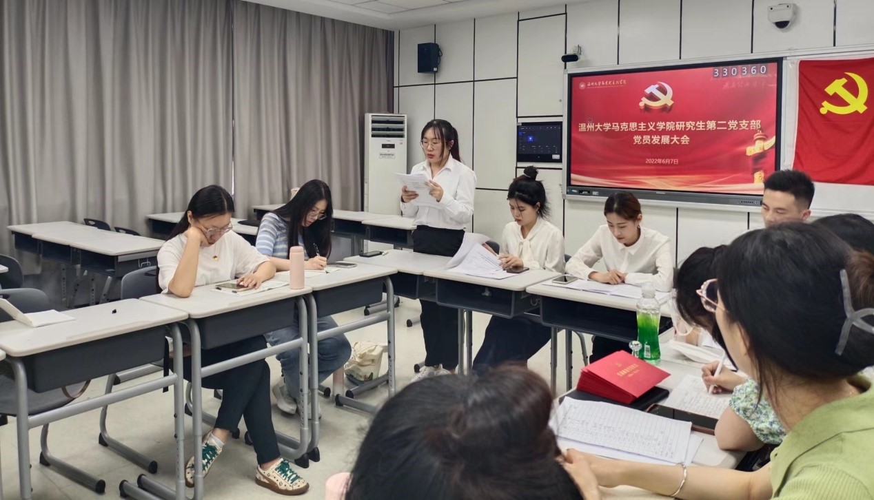 为进一步加强和推进党员队伍建设,为基层党支部注入新鲜血液,根据《中国共产党发展党员工作细则》和《党章》等相关规定,6月7日,黑料不打烊 研究生第二党支部于瓯四-206召开党员发展大会,黑料不打烊 团委书记、学工办主任曹开秋老师莅临指导。会议由党支部书记刘宁涛主持。全体党员与发展对象参与会议。