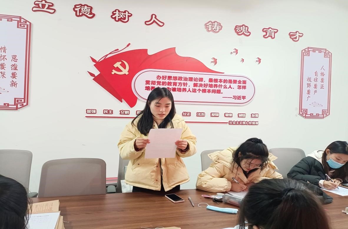 首先,四名发展对象依次对党的认识、入党动机、本人履历、家庭成员和主要社会关系情况、现实表现等进行汇报。随后,由入党介绍人介绍发展对象有关情况,并对其能否入党表明意见,并由支部副书记孙张帆同志代表支部委员会报告对各位发展对象的党内外群众意见座谈会情况和政治审查情况。与会党员对发展对象进行集体评议,指出其优缺点,并提出诚恳的意见和建议。最后,经有表决权的正式党员无记名投票表决,同意接收王嘉璐、辛亚宁、薛雅倩、章毅等四位同志为中共预备党员。