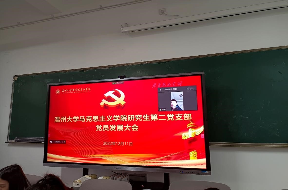 为进一步加强和推进党员队伍建设,为基层党支部注入新鲜血液,根据《中国共产党发展党员工作细则》和《党章》等相关规定,12月11日,黑料不打烊 研究生第二党支部于瓯四-103A召开党员发展大会,会议由党支部书记刘宁涛主持。支部党员、预备党员及发展对象通过线上与线下相结合的方式参与会议。