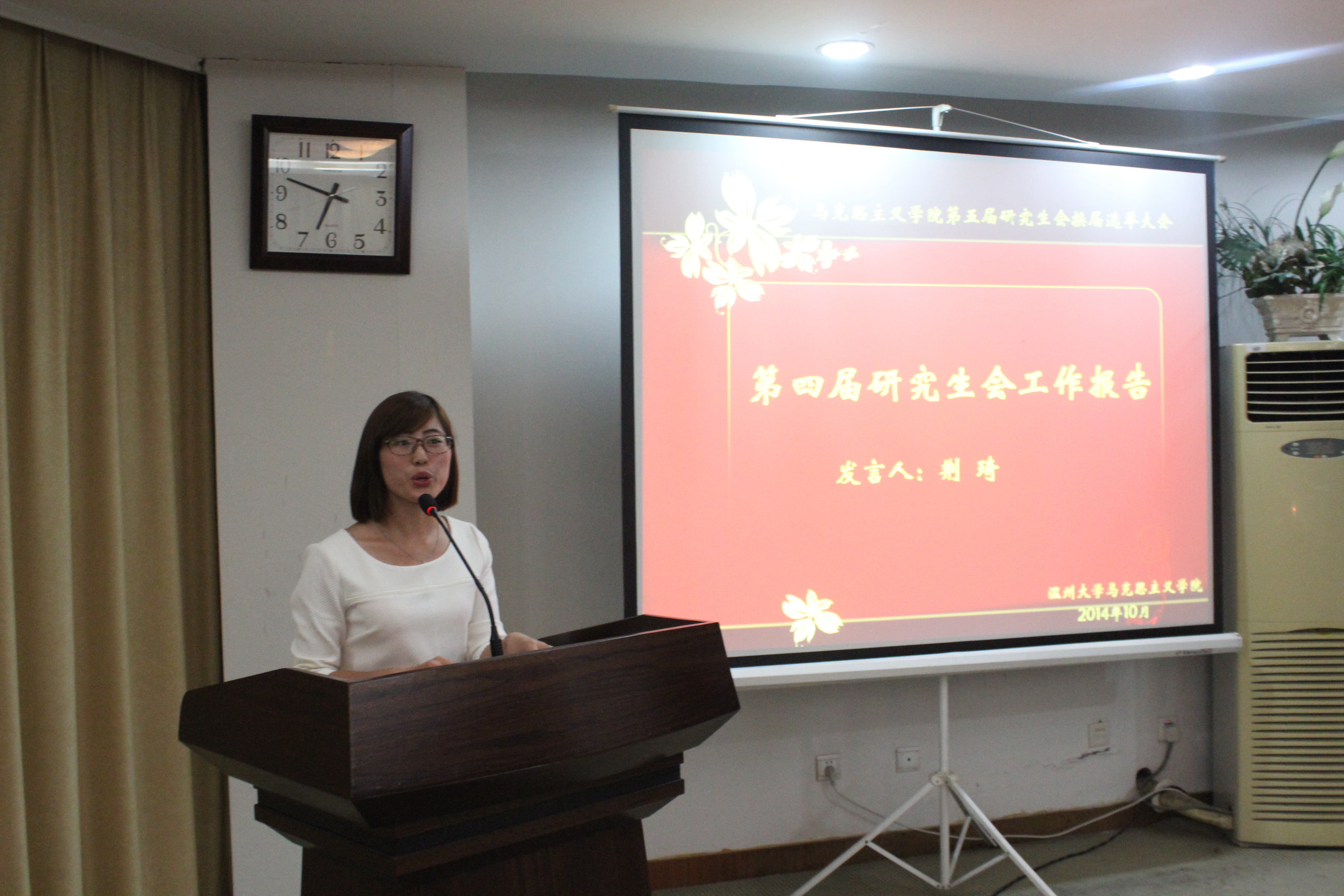 研究生会在过去的一年里,发扬了马院团结一致、务实奉献的优良传统,坚持了“自我服务、自我教育、自我管理”的宗旨。第四届研究生会的同学们坚持全心全意为同学服务,为学院、学校各项事业的发展做出了积极贡献。卓副院长强调参与研究生会换届选举大会是研究生参加民主政治生活的重要途径和方式。他肯定了第四届研究生会全体成员各项活动所取得的成绩,赞赏了同学们在举办各类活动中“弘扬主旋律,传播正能量”的良好精神面貌。马院第四届研究生会主席荆琦同学对过去一年的研会工作做了全面总结,回顾了研究生会服务学生、服务学院学校、服务社会的点点滴滴,与同学们分享了自加入研究生会以来的辛勤、汗水、感动和成长。