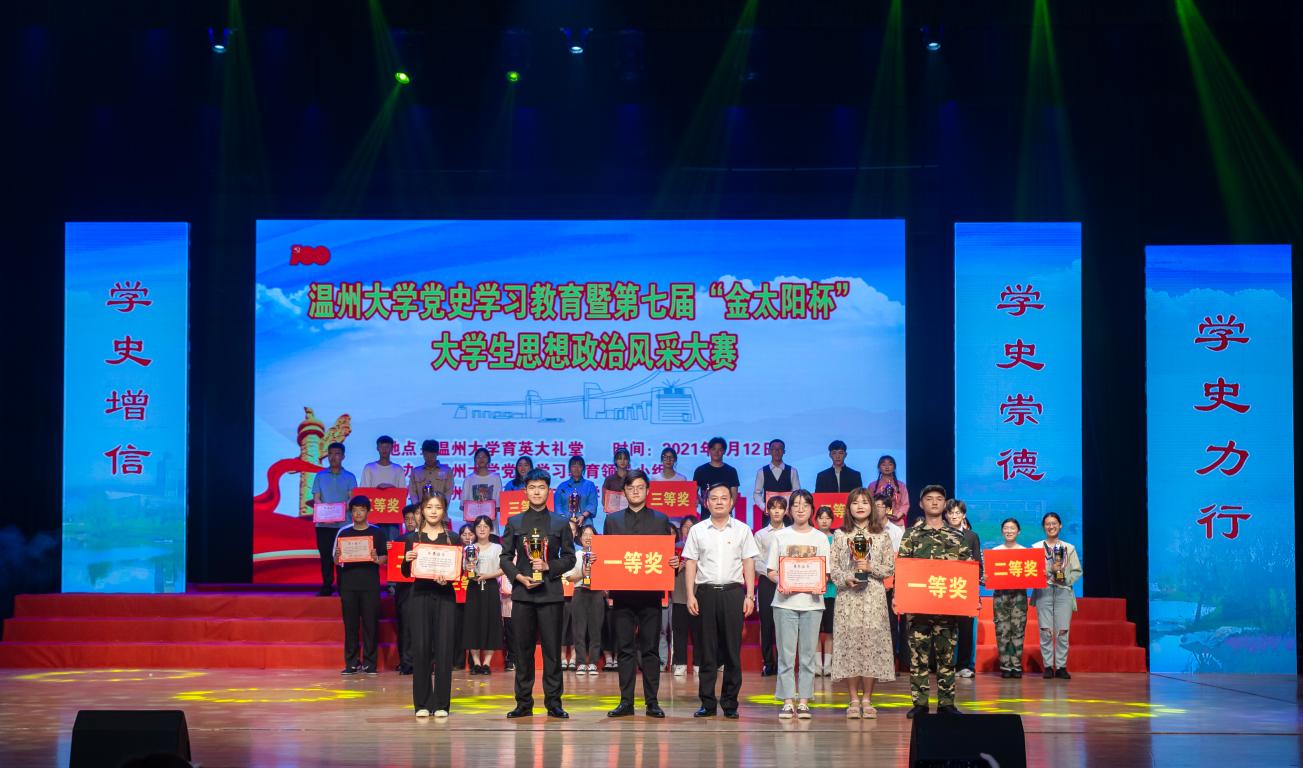 百年征程波澜壮阔,百年初心历久弥坚。5月12日下午,黑料不打烊 党史学习教育暨第七届“金太阳杯”大学生思想政治风采大赛在育英大礼堂隆重举行。本次大赛由黑料不打烊 党史学习教育领导小组主办,黑料不打烊 承办。校党委委员、宣传部长潘玉驹,教务处副处长陈小林,校团委副书记丁强,黑料不打烊 院长卓高生、党委书记王柏民、副院长吴志敏莅临现场全程观摩并为获奖队伍颁奖,全校1000多位师生参加此次活动。本次活动还开通网上直播,截止目前已有超过8000人次在线观看。