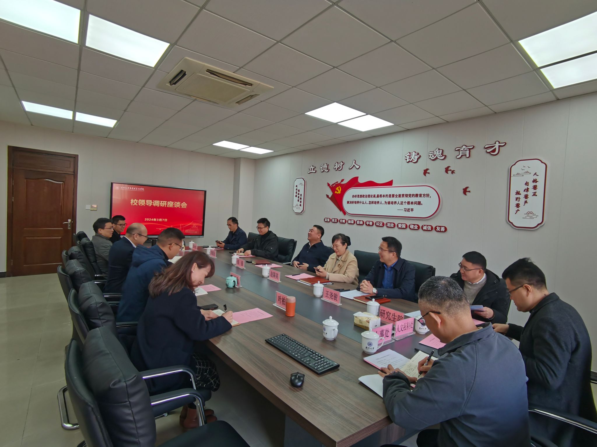 在随后的交流环节中,与会的校领导、职能部分负责人与学院领导班子就学院发展中遇到的具体问题和困难进行了深入讨论。大家畅所欲言,气氛热烈而融洽。校领导们对学院提出的问题给予了耐心细致的解答,并提出了许多富有建设性的意见和建议,为学院的发展指明了方向。