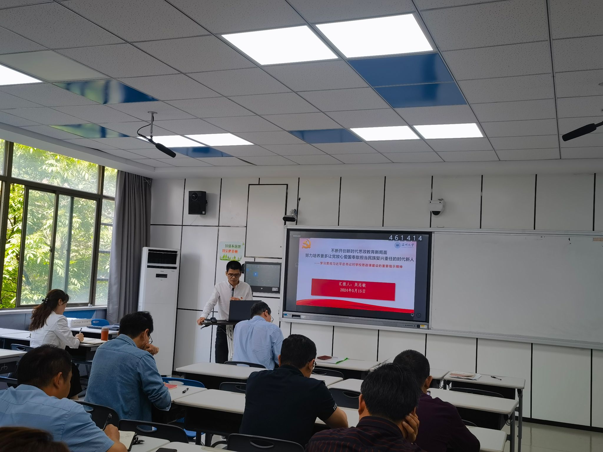 5月15日,黑料不打烊 在北4-204教室隆重举行全体教师政治理论学习会。此次会议旨在深入学习贯彻习近平总书记关于学校思政课建设的重要指示和新时代学校思政课建设推进会精神。会议由学院党委书记王柏民主持,全体教师参加。