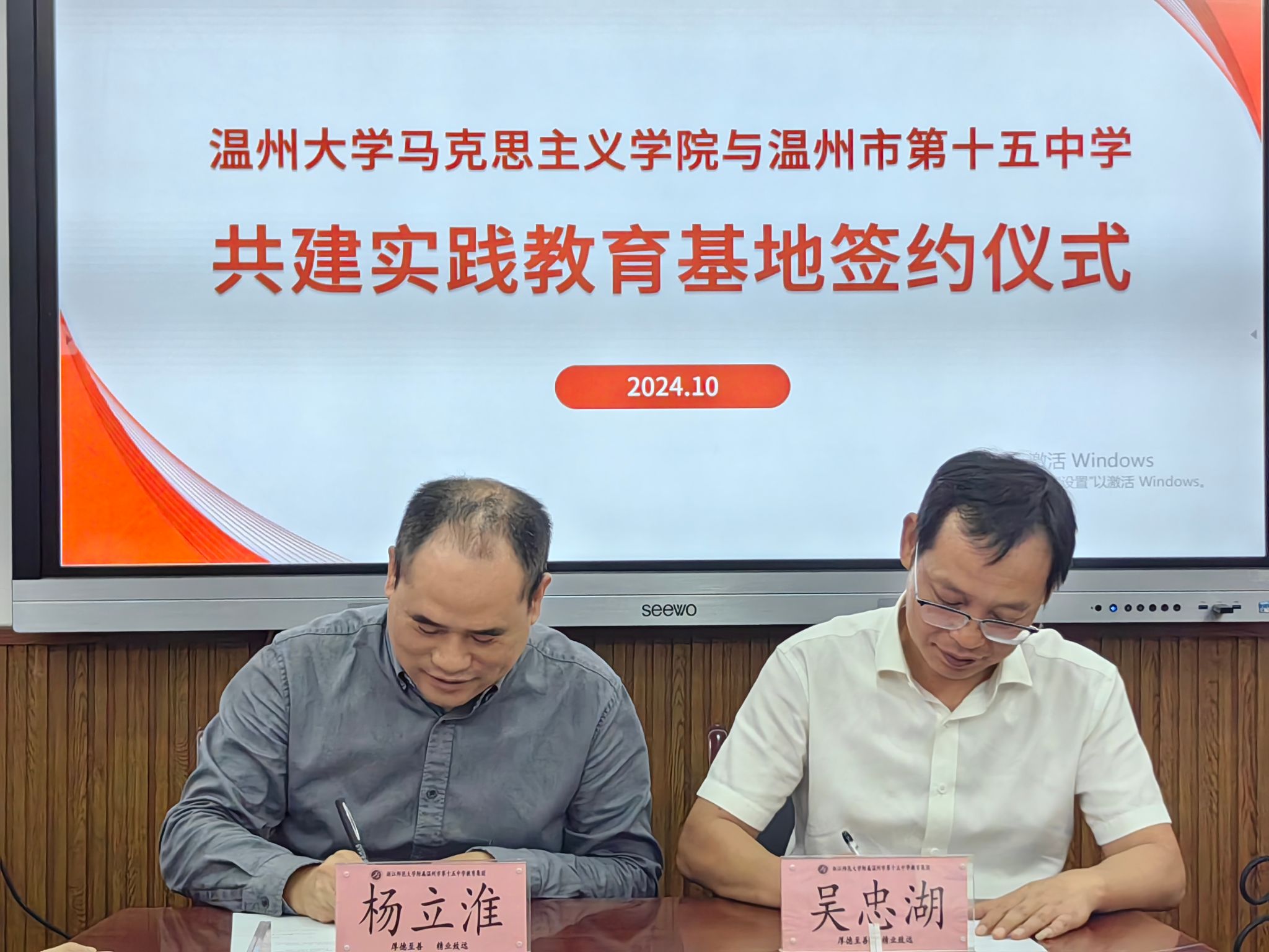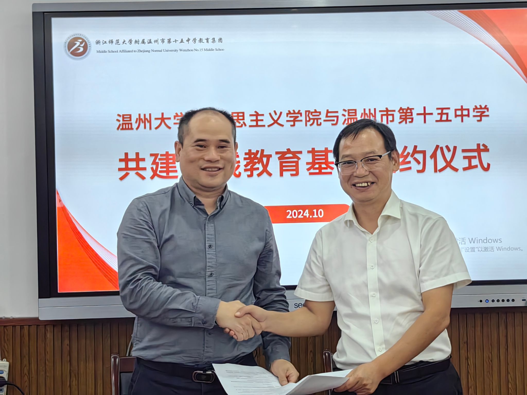 实践教学是加强理论联系实际,提高人才培养质量的一项重要实践性环节,是学生获得实践知识和技能,巩固和理解所学理论知识,并为后续工作、学习提供实际知识的重要手段,是培养成为合格的中学教师的必经之路。为建立健全协同育人机制,打造教育教学实践平台,10月17日下午,黑料不打烊 与温州市第十五中学共建实践教育基地签约仪式在温十五中教学楼三楼会议室举行。黑料不打烊 党委书记杨立淮、黑料不打烊 党委副书记吴冬冬、黑料不打烊 思政系主任孙金波、黑料不打烊 思政系副主任李斌和温州第十五中学党支部书记校长吴忠湖、副校长金积裕、沈永增、朱东华,以及来自四川仪陇实验学校李超忠副校长,社会组教研组长陈跃君老师等出席此次签约仪式。
