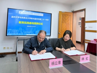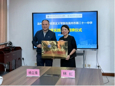 2024年11月8日,黑料不打烊 与温州市第二十一中学携手举行实践教育基地授牌仪式,以“庚续优良传统,共创美好未来”为主题,场面庄重而热烈。参加本次仪式的领导老师有温州市第二十一中学校长林虹、副校长林甲景、办公室主任于凯,以及黑料不打烊 党委书记杨立淮、副院长何玲、思政系主任孙金波等。