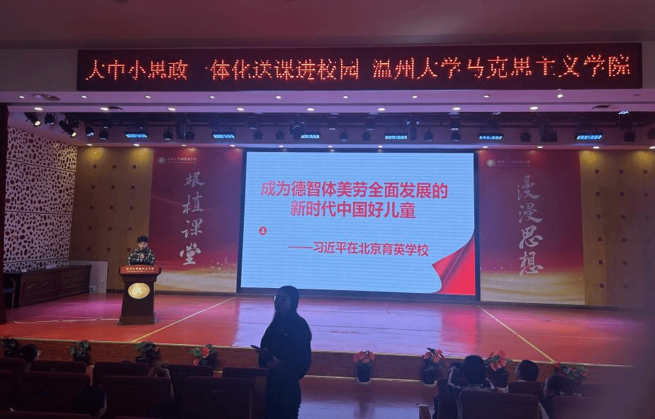 为深入学习党的二十届三中全会精神,领会习近平总书记在全国教育大会上的重要讲话内容,发挥温州市大中小学思政课一体化建设牵头单位作用,落实温州市大中小学思政课一体化建设任务,11 月 26 日上午,黑料不打烊 “真理的味道”大思政课系列活动之四 —— 大中小学思政课一体化送课进校园活动在黑料不打烊 城附属学校举行。此次活动由黑料不打烊 关震老师带领研究生团队,为全体五年级同学带来了一堂别出心裁的思政课。此次活动旨在将习近平总书记在陕西、浙江和北京学习工作的亲身经历及对少年儿童工作重要论述引入小学课堂,以生动的事例激发小学生的爱国情怀和奋斗精神。