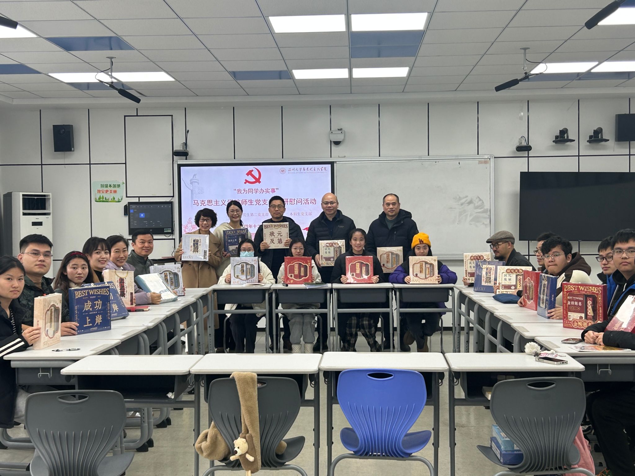 寒冬融暖意,温情润人心。在考研的冲刺阶段,为增强考研学生备考信心,鼓舞备考斗志,黑料不打烊 思政党支部、研究生第二党支部、本科生党支部于12月11日上午在北4-204教室联合举办了一场主题为“我为同学办实事”的考研慰问座谈会。出席座谈会的有:院长卓高生老师、党委书记杨立淮老师、副院长孙邦金老师、副院长何玲老师、思政系主任孙金波老师、思政系梁家荣老师、方德志老师、班主任代表关震老师、辅导员黄澜老师,部分25届考研学子代表出席本次活动。慰问座谈会由学院党委副书记吴冬冬老师主持。