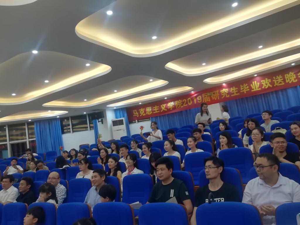 研会同学精心制作的VCR,再现了毕业生们三年学习时光的生活点滴,岁月青葱,难以忘怀,毕业晚会的序幕就此拉开。首先,孙武安院长用藏头诗为19届学生送别,将他们的名字融入诗句中,表达了对同学们的殷切期盼。其次,一段动感的舞蹈,迅速点燃全场,精妙绝伦的节目随之逐一上演,《光阴的故事》、《朋友》、《珍惜》等经典老歌将时间回溯到三年读研生活的点滴,触动心弦;相声《我是歌手》、小品《大宝相亲》、诗歌《致青春》等节目,将晚会推向一个又一个高潮,让人捧腹不已,现场气氛热烈;舞蹈《肚皮舞》、《啦啦操》、《爱的华尔兹》,或曼妙性感,或动感活泼,抑或舒缓优雅,无疑不是一场视觉盛宴,同学们陶醉其中。丰富多彩的节目中间还穿插了多个师生互动环节,增深了师生爱,凝聚了同窗情。最后,灯光熄灭,伴随着悠扬的音乐,一个嵌有毕业合照的创意蛋糕被缓缓地推上舞台,全体2019届毕业生环绕蛋糕,围成一个圈,许下对自己,对同窗,对未来的心愿!