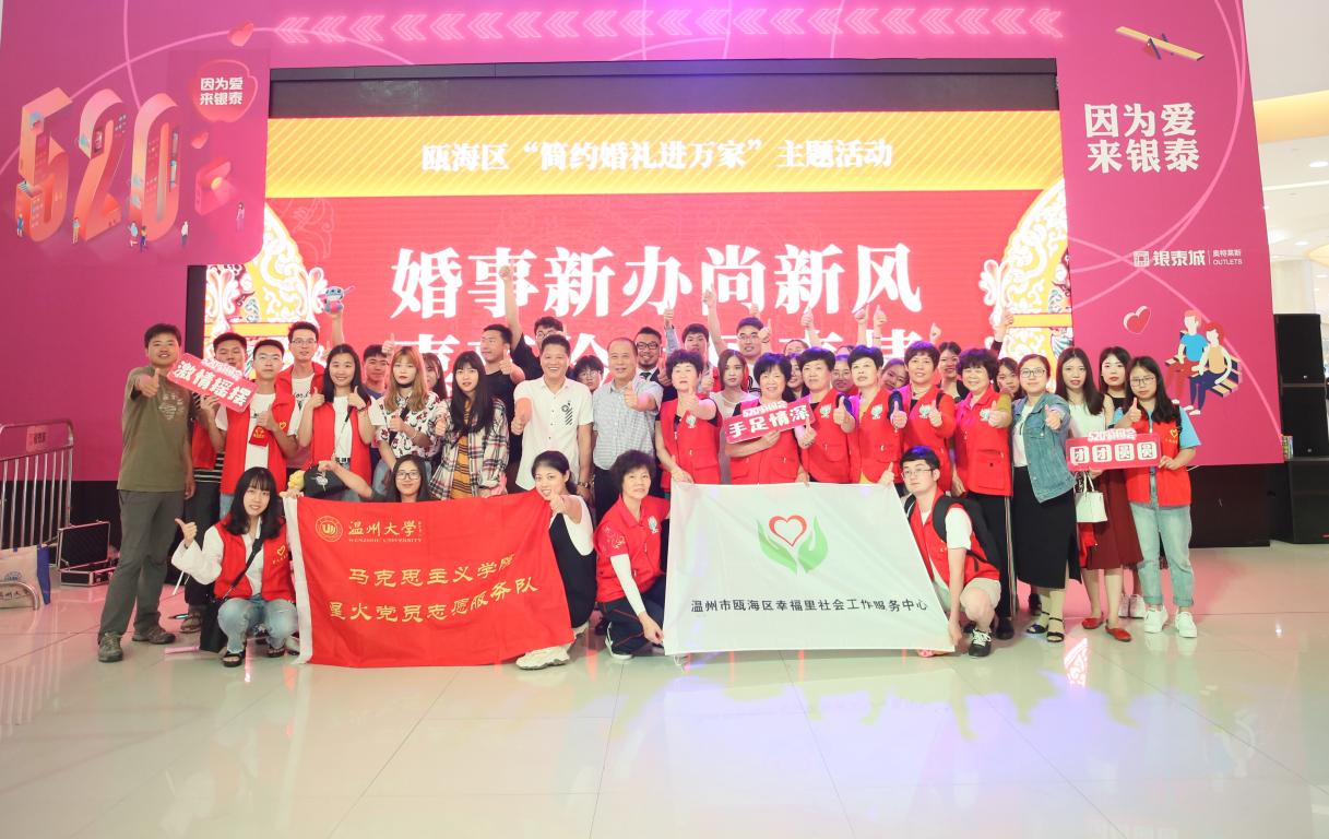 为推进瓯海区移风易俗改革攻坚行动深入开展,5月20日,由瓯海区精神文明建设指导中心、共青团瓯海区委员会、温州银泰城主办,瓯海区幸福里社会工作服务中心承办的“简约婚礼进万家”主题活动在温州银泰城一楼中庭顺利举行。马院星火党员志愿服务队参与了此次活动。