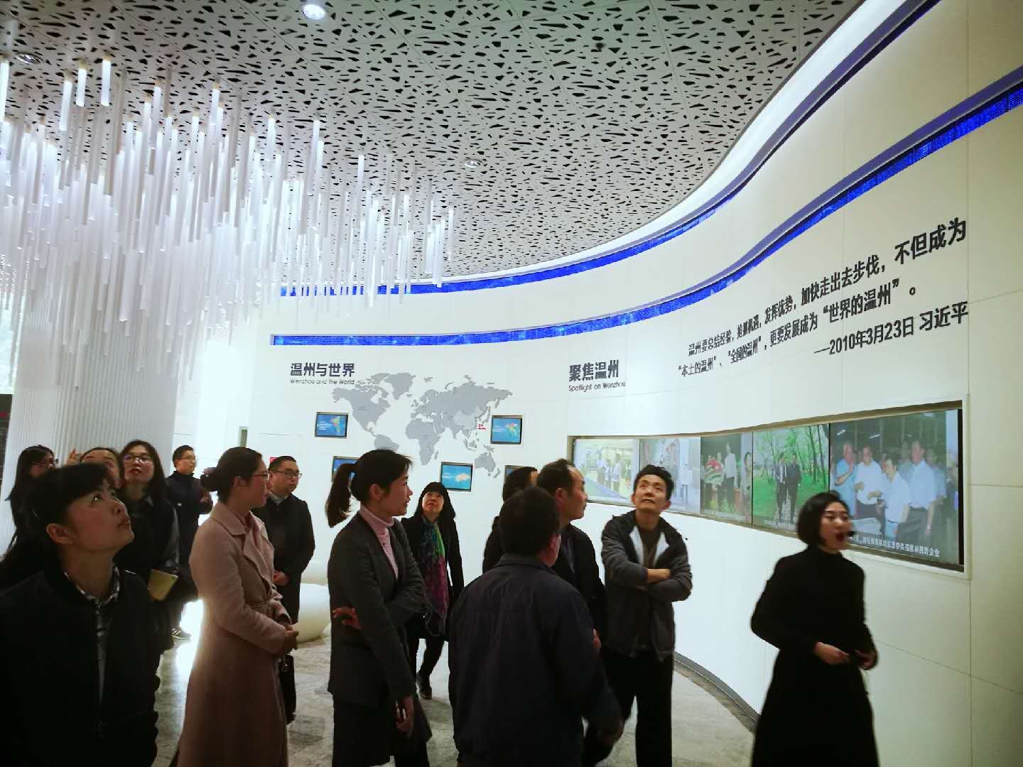 党员们在讲解员的带领下参观了上下三层规划厅。规划厅以“山水智城,世界温州”为主题,利用文字、图表、照片、实物、沙盘模型等形式和声、光、电、多媒体等现代科技手段,分别展示温州城市建设的过去、现在和未来。老师们边走边听边看,“主题形象墙”融入温州江海元素,演绎温州由“沿江时代”向“沿江与沿海并重时代”跨进的大气魄和敢为人先的温州精神;“智慧古城”演示模型还原温州历史面貌,展示温州独特的城建历史和厚重的文化积淀;“时尚之都”显示温州要推动传统产业向时尚产业升级,体现了高科技和未来感;目前国内最大的LED数字沙盘动态、直观的展示大都市、大温州的演变发展和总体规划,令人震撼震撼;4D影院则带领我们感受温州千年时空的穿梭,欣赏山水温州的秀丽美景,体验温州的千年文化底蕴,展望温州迈向海洋的战略规划……