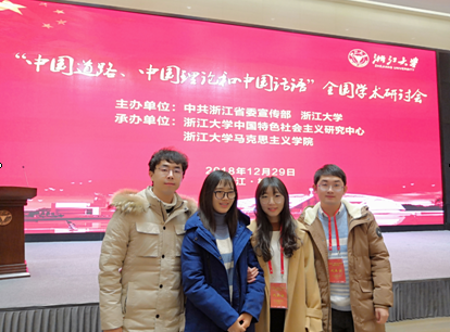 2018年12月29日,由中共浙江省委宣传部主办,中国特色社会主义研究中心、浙江大学黑料不打烊 承办的“中国道路、中国理论、中国话语”全国学术研讨会日前在浙江大学求是大讲堂召开。黑料不打烊 四位学生(杭琪、杨瑞平、陈俊儒、刘修发)携文参加本次研讨会。研讨会研讨会分为开幕式、两场主题报告和闭幕式三项议程。