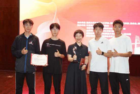 伴随着激昂的音乐声,大屏幕播放着获奖队伍的作品精简合集视频,其中荣获一等奖的参赛微电影《青春逆旅逐梦新华章》通过一场跨越百年的青春对话,将五四精神与当代青年的思考完美融合。主持人对这部作品的编剧兼导演的张锦源同学进行采访,他回答道作品是用‘穿越梦境’的形式来激励着当代青年继承和发扬五四精神,参演人员还分享了自己对角色的感悟及其获奖感言。