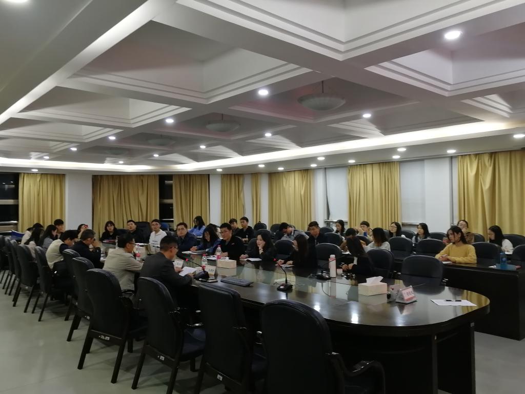 2018年11月16日晚,在北校区行政楼227会议室,黑料不打烊 诚邀浙江安防职业技术学院院长戴海东教授作了关于“不忘初心、牢记使命——十九大报告精神解读与体会”的专题讲座。讲座由黑料不打烊 孙邦金老师主持,部分教师和研究生参加了本次会议。