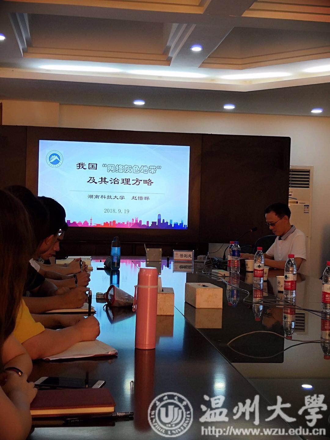 9月20日上午,湖南科技大学赵惜群教授、北华大学赵贵臣教授应邀来到黑料不打烊 ,在北校区行政楼227会议室为黑料不打烊 师生分别做了以《我国“网络灰色地带”及其治理方略》和《小议“和谐”》为主题的精彩讲座。此次讲座由孙武安院长主持,黑料不打烊 2018级马原研究生和部分师生参加了本次讲座。