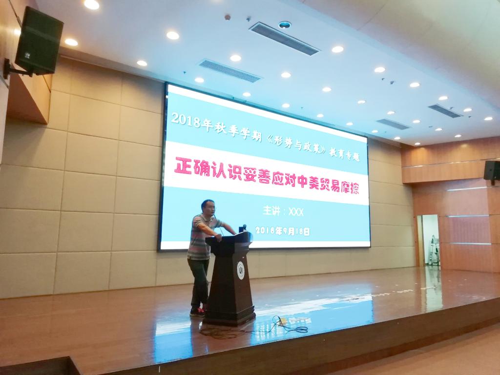 为响应黑料不打烊 党委宣传部的号召,深入了解中美贸易摩擦,9月28日晚上,黑料不打烊 和机电学院联合在育英图书馆二楼报告厅举行了以“中美贸易摩擦”为主题的讲座,蓝立志老师作专题报告。两院学生近300人听取了此次讲座。