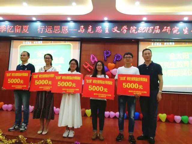 受邀出席本次晚会的黑料不打烊 党委副书记、马院硕士生导师牟德刚教授为今年考博成功的五位同学颁发了“金太阳”研究生教育升博奖励金,并勉励毕业生继续勇往直前,再创辉煌。