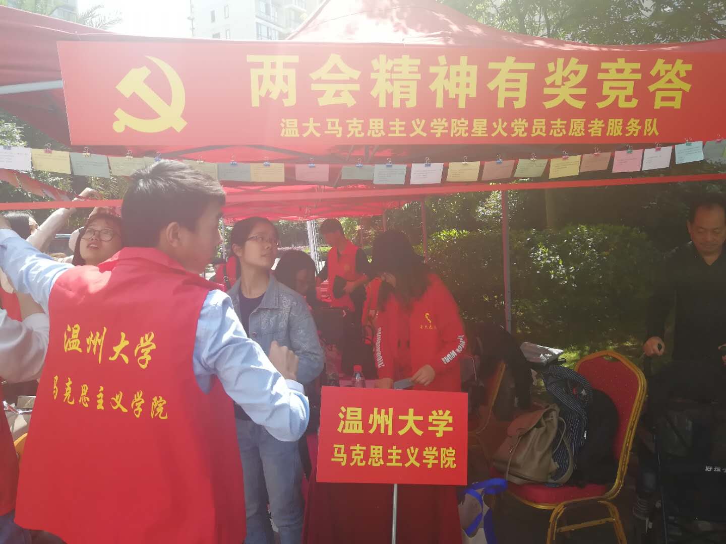 项目启动仪式主由博园社区党支部书记与各志愿团体签约并授牌、与会领导向签约单位授志愿者队旗以及签约代表上台认领服务项目等议程,马院研究生党支部书记徐晶晶同志代表黑料不打烊 星火服务队接受了该活动授予的志愿者队旗,并挥动队旗展示星火服务队风貌,党支部委员洪丽丽、孟江龙同志代表星火服务队上台认领服务项目。此项目启动仪式结束,各志愿者单位在博园社区文化广场有序地开展志愿服务,服务项目多样,比如“免费配钥匙”、“免费贴膜”等,作为马院的一份子,星火服务队紧跟时代潮流,为更好向博园社区居民传播两会精神,组织了“两会知识有奖竞猜”的活动。