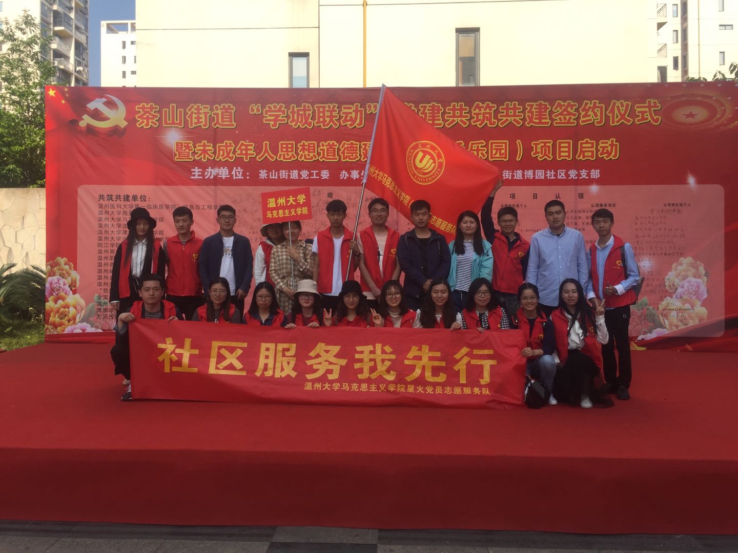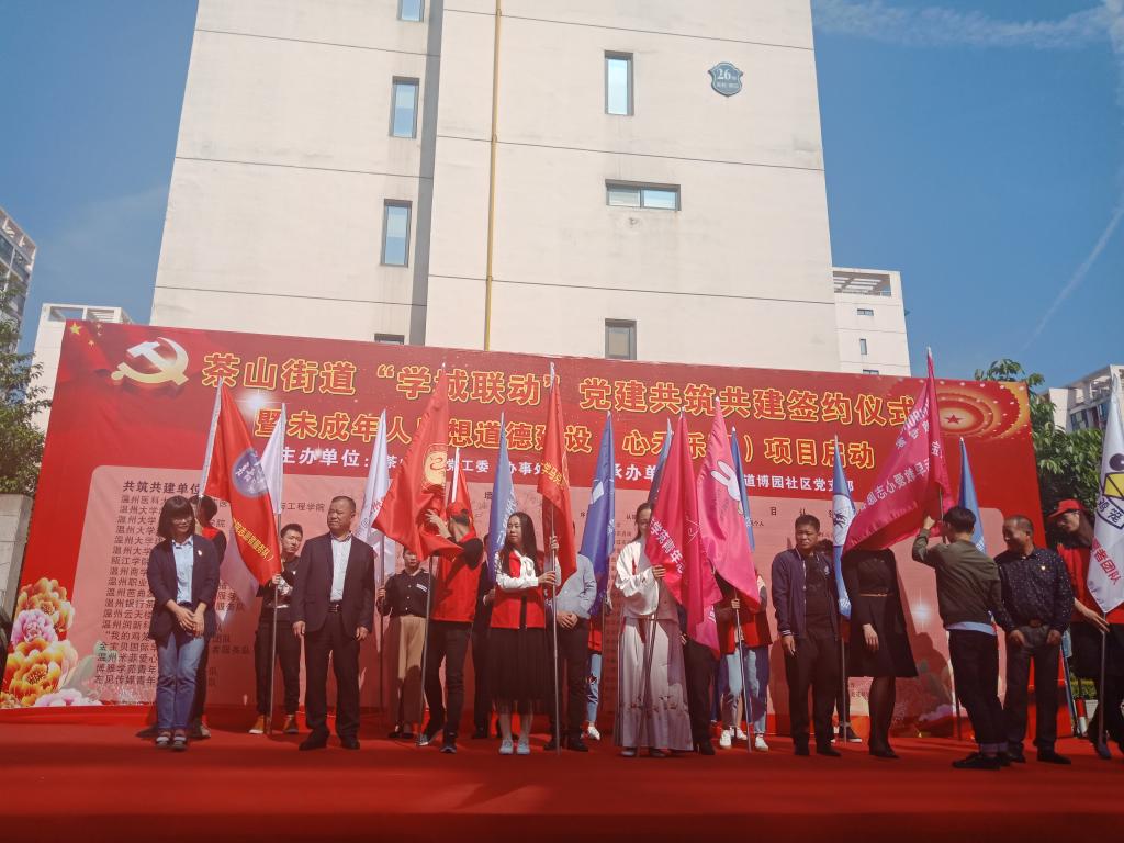4月18日下午,瓯海区茶山街道党工委、办事处在博园社区文化广场举行茶山街道“学城联动”党建共建共筑签约仪式暨未成年人思想道德建设“心禾乐园”项目启动仪式,出席活动的有瓯海区委组织部、博园社区及黑料不打烊 超豪学区等单位领导,马院研究生星火服务队作为志愿项目认领团队参与了此次仪式。
