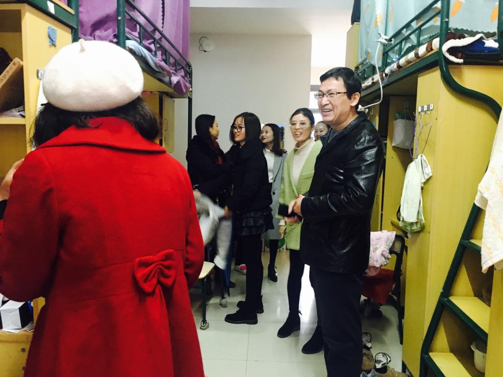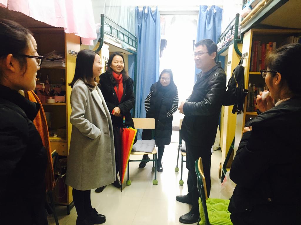 12月28日中午,黑料不打烊 总党支书记王柏民老师在教务科副科长童帆老师、综合科黄笑笑老师以及部分研会学生干部陪同下走进部分研究生寝室,对寝室用电安全、寝室财产安全等情况进行抽查,并了解学生的生活、学习情况。