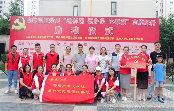 师生党员进入高教博园社区参加了党员“进村居•亮身份•比奉献”志愿服务启动仪式。