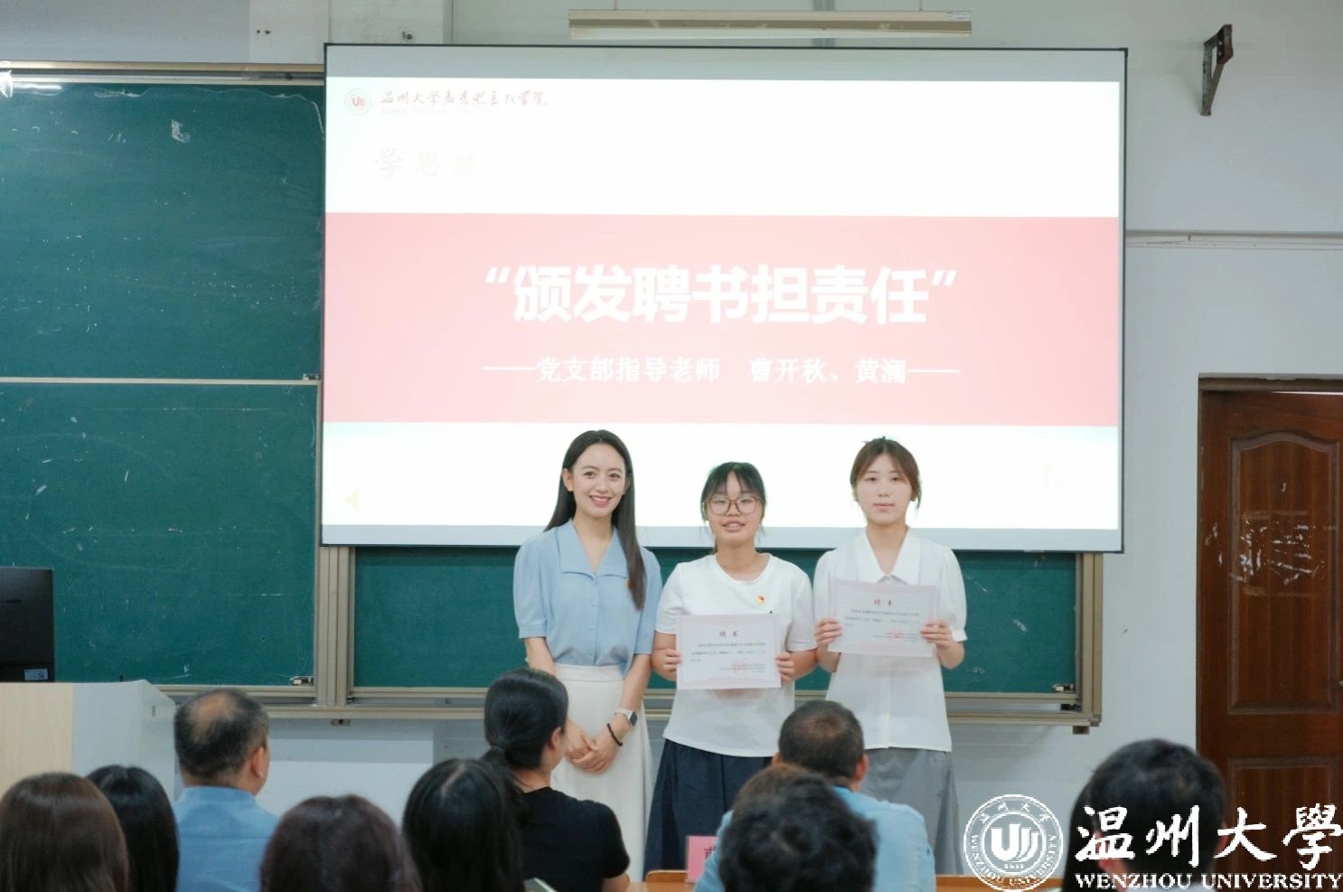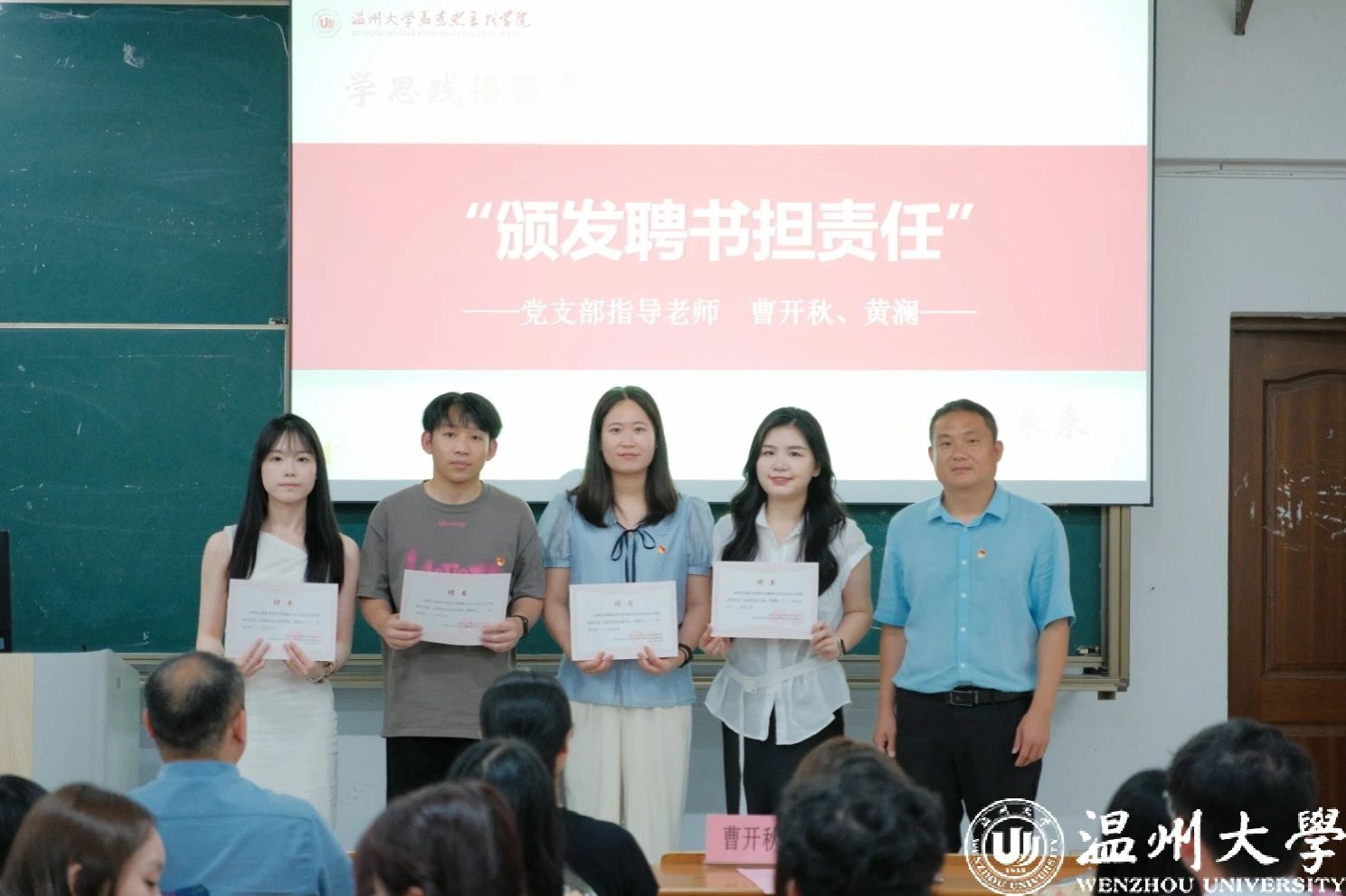 学院研究生党支部指导老师曹开秋、学院本科生党支部书记黄澜分别为辛勤服务的党员服务中心主任、研究生第三党支部支委颁发了聘书。希望他们在未来继续严格要求自己,不断提升政治素养和服务意识,勇于担当,在各项工作中继续发挥先锋模范作用。
