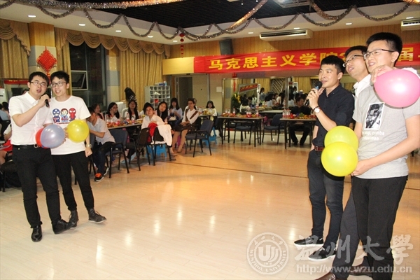 晚会伊始,孙武安院长作晚会致辞,孙院长摘取了13级17位毕业生姓名中的一两个字,精心创作了一首题为“风雨同舟”的诗句,由此拉开了晚会的精彩序幕。此次送别晚会分为 “青春飞扬、一生有你、再启程”三个篇章,每一篇章均包含着由同学们精心准备的节目。在同学们的热情邀请下,王柏民书记、卓高生副院长、曾蓓蕾老师等也进行了精彩的节目表演,并将晚会推向了高潮。歌曲、朗诵、小品、游戏等节目让大家高兴地合不拢嘴,但当老师同学们对毕业生献上祝福时,毕业生们又都忍不住地热泪盈眶。晚会还安排实现毕业小心愿等环节,毕业生曲小远的《马院三年》语言小品让所有在场的人再次回忆了马院共同经历的点点滴滴,将晚会推向高潮。